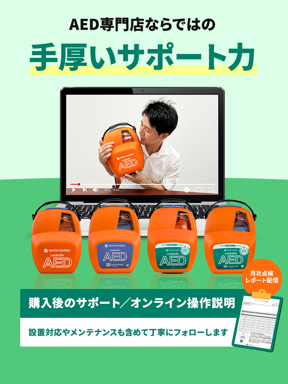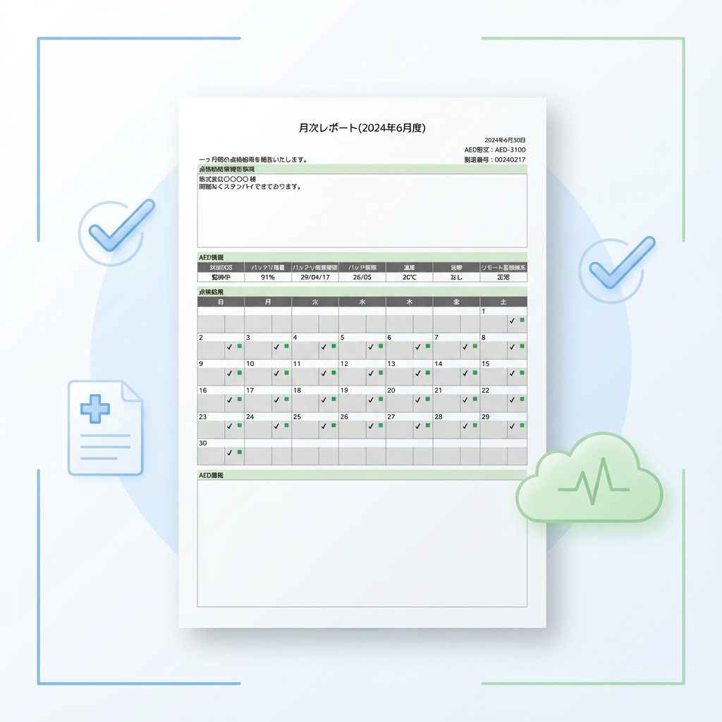 当社では、リモート点検サービスに加えて毎月の記録をまとめた『AED月次点検レポート』をお届けしており、担当者が無理なく、確実に管理できる体制を整えています。