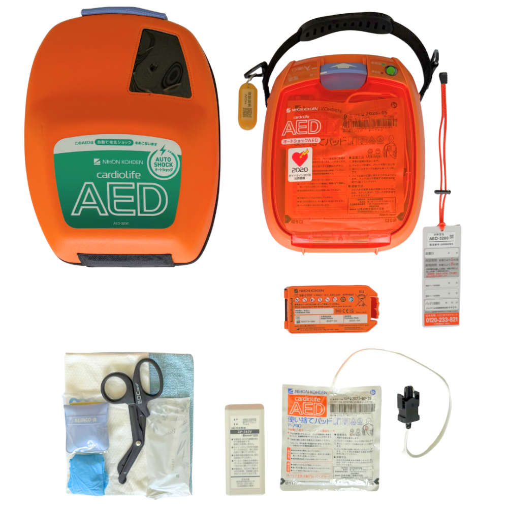 ・AED自動体外式除細動器 本体 1台・キャリングケース 1個・使い捨て除細動パッド 2枚・バッテリパック1個・レスキューキットYZ-043H3・ポスターA3サイズ・AED 設置シールA5サイズ(片面)・取扱DVD