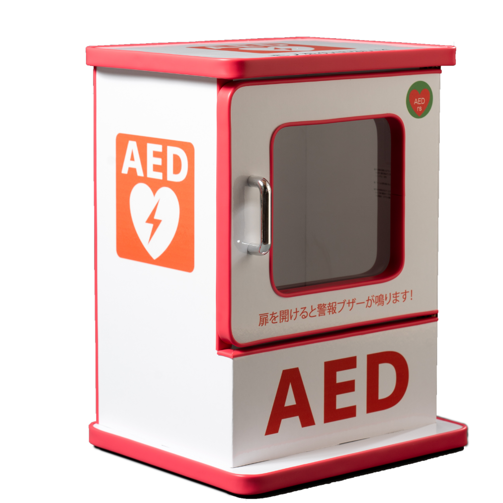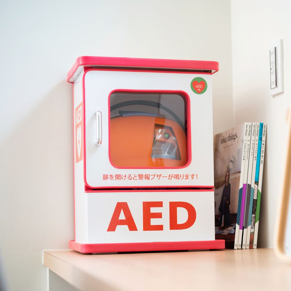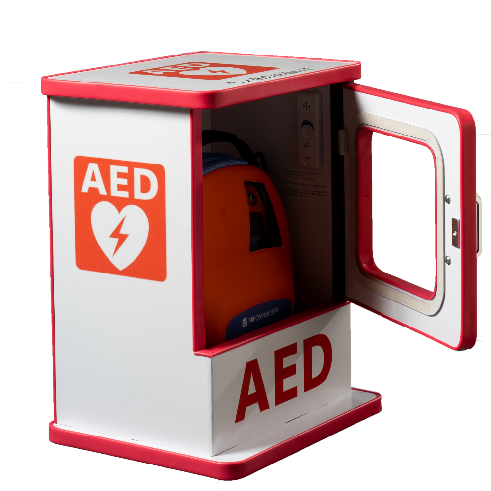 AEDが目立つ特殊強化ダンボール製の卓上AED収用ボックス。