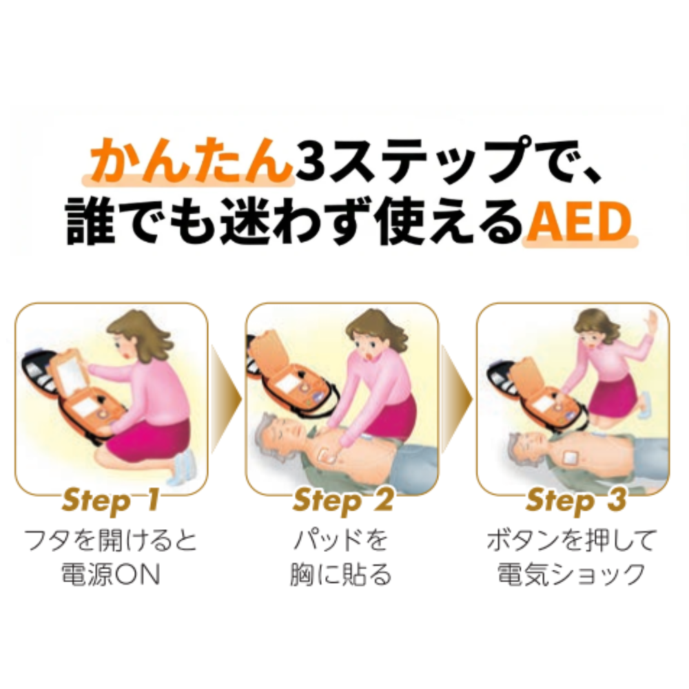 - 色分けされたパッドを胸に貼るだけで、AEDが心電図の解析を開始します。