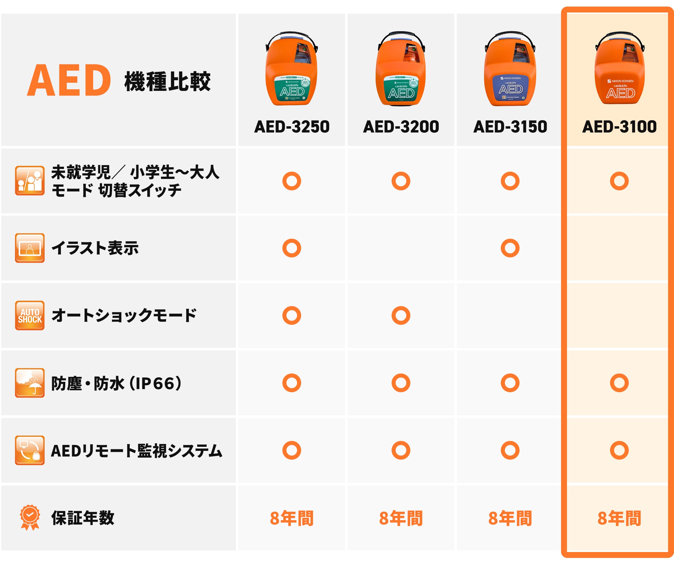 国内メーカー製のAEDのみを取り扱い、万が一の故障やトラブルにも安心していただける「本体8年保証」を標準でご提供しています。