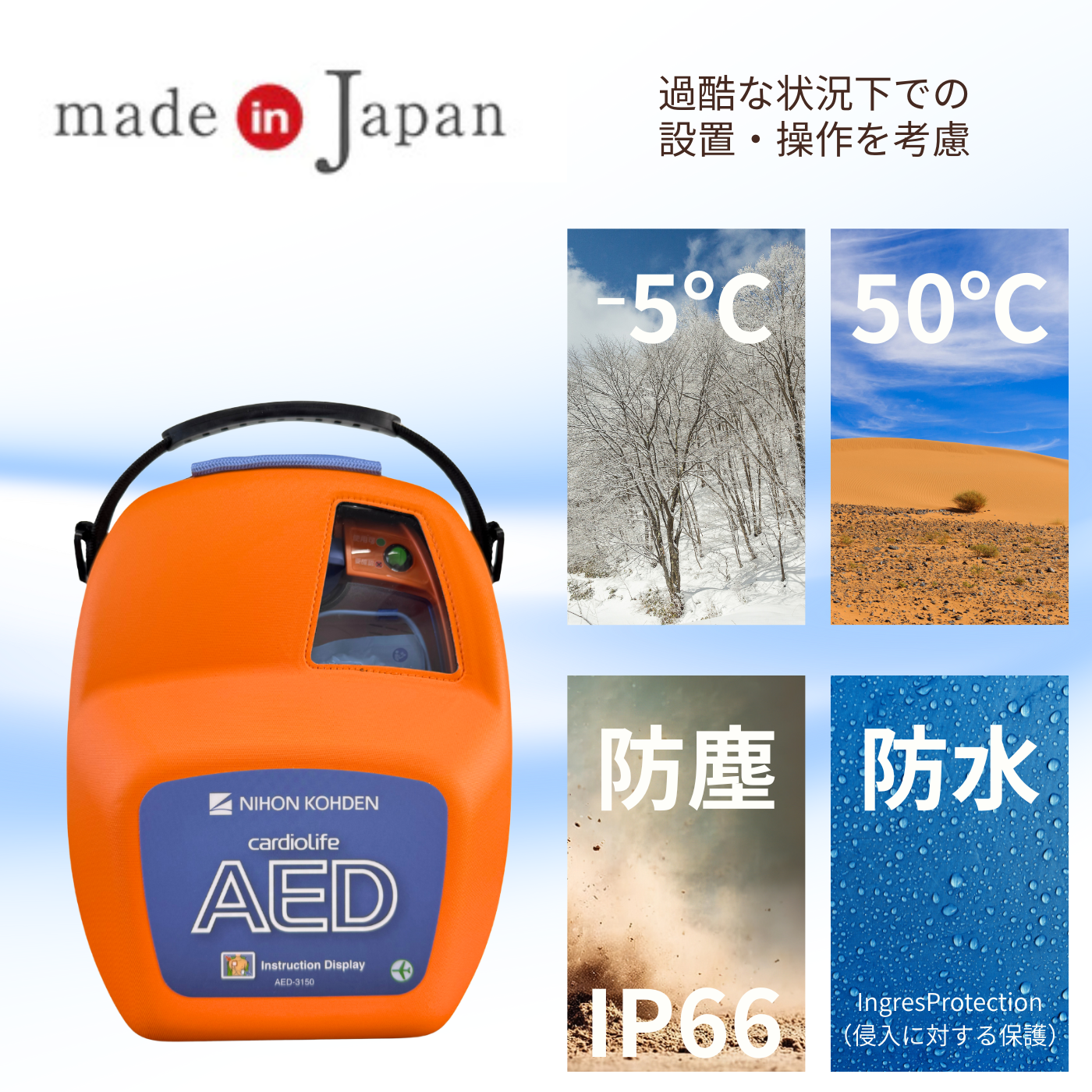 - -5~50℃の環境でも操作が可能。また、IP66に準拠した防塵性および防水性を備えており、過酷な状況でもの使用を考慮しました。