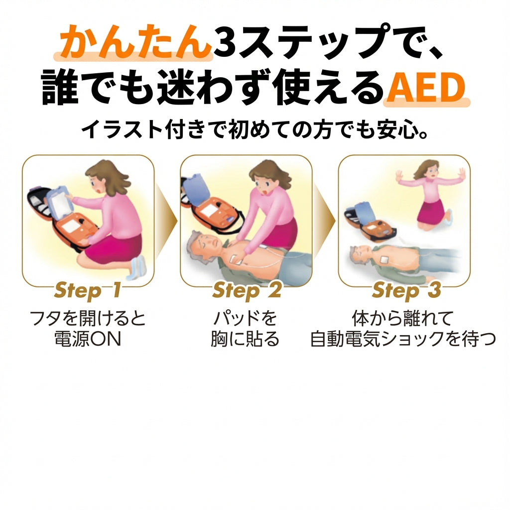 - 色分けされたパッドを胸に貼るだけで、AEDが心電図の解析を開始します。