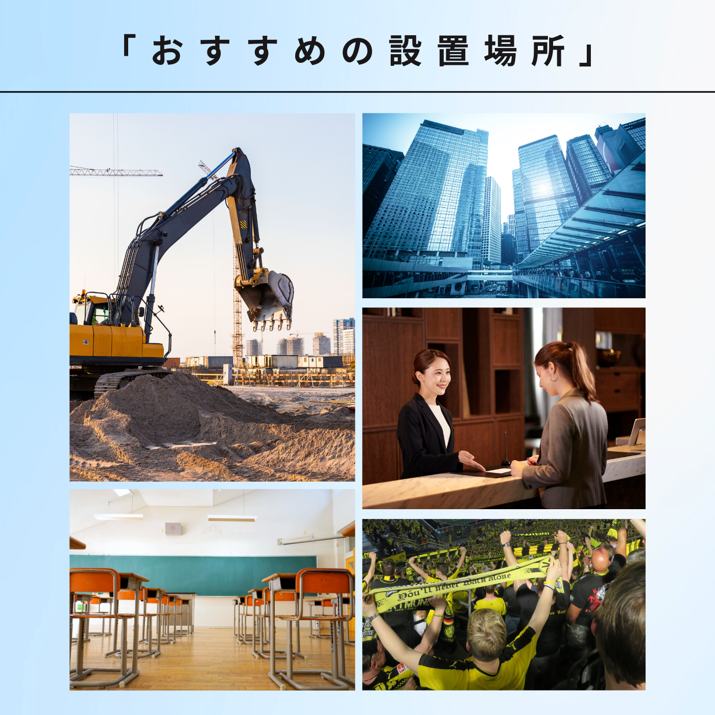 〈工場・工事現場・スポーツ施設 〉重機の稼働音や大歓声など、音声ガイドが遮られやすい環境に最適です。耳だけでなく、画面の指示を見ることで、騒音の中でも正確な救助活動を可能にします。