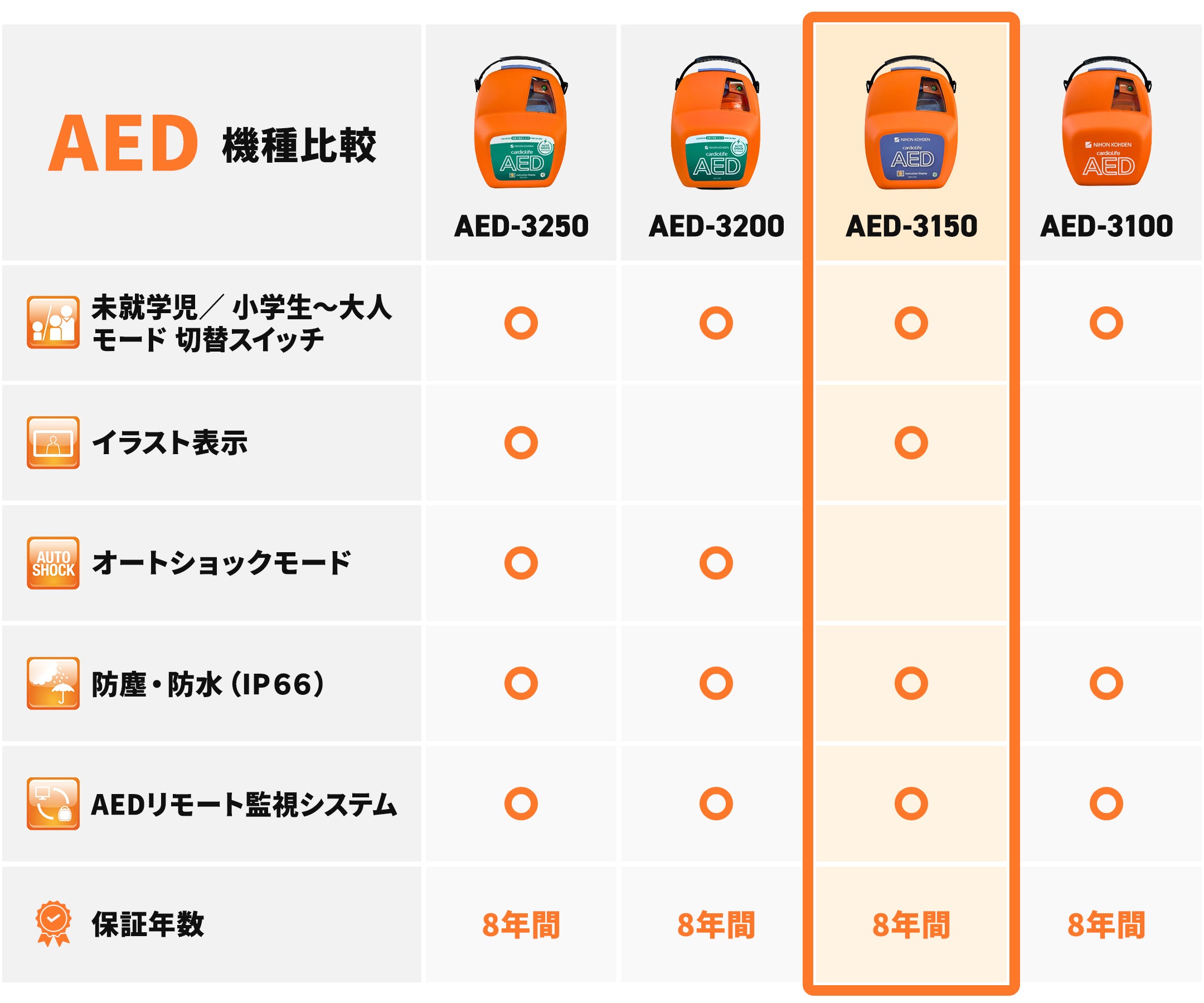 国内メーカー製のAEDのみを取り扱い、万が一の故障やトラブルにも安心していただける「本体8年保証」を標準でご提供しています。