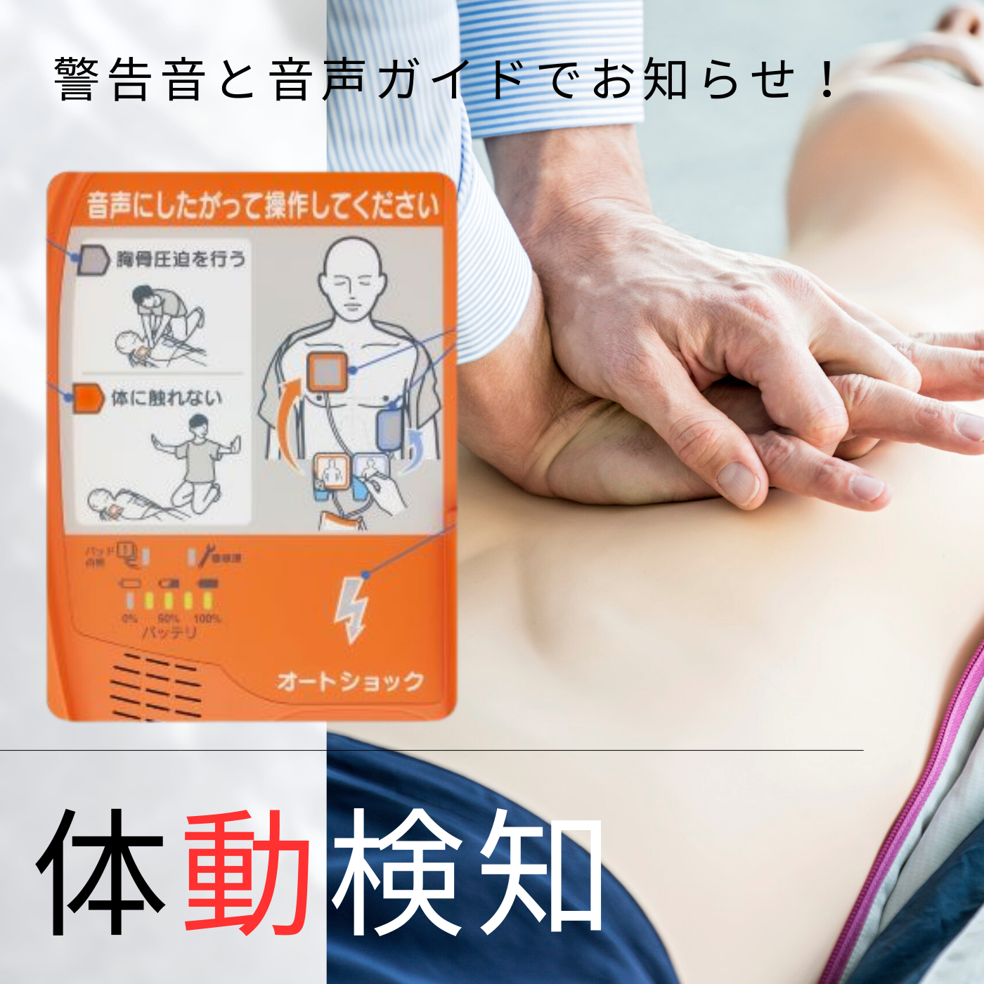 - 周囲の安全を守る「体動検知機能」 電気ショックの直前まで、傷病者の体の動きを常に監視します。もし誰かが体に触れているなど「動き」を検知した場合は、音声で警告し、ショックを一時中断。機械が安全を確認してから動作するため、救助者も周囲の人も安心です。また、電気ショックの直後に胸骨圧迫が途切れている場合、自動で再開を促すアナウンスが流れ、迷いのない継続的な救助をサポートします。