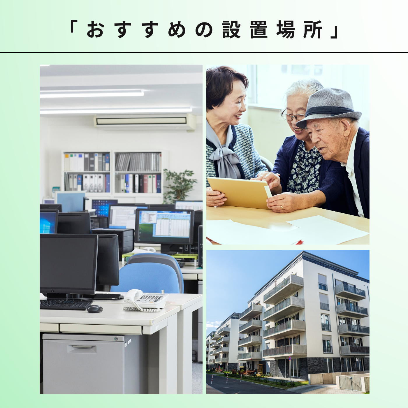 〈自治会・公民館などの地域拠点〉ご高齢の方が多い場所では、情報量を絞ったシンプルな構成が、かえって混乱を防ぎます。「指示に従うだけ」という設計は、地域のみなさまが協力し合える環境を作ります。