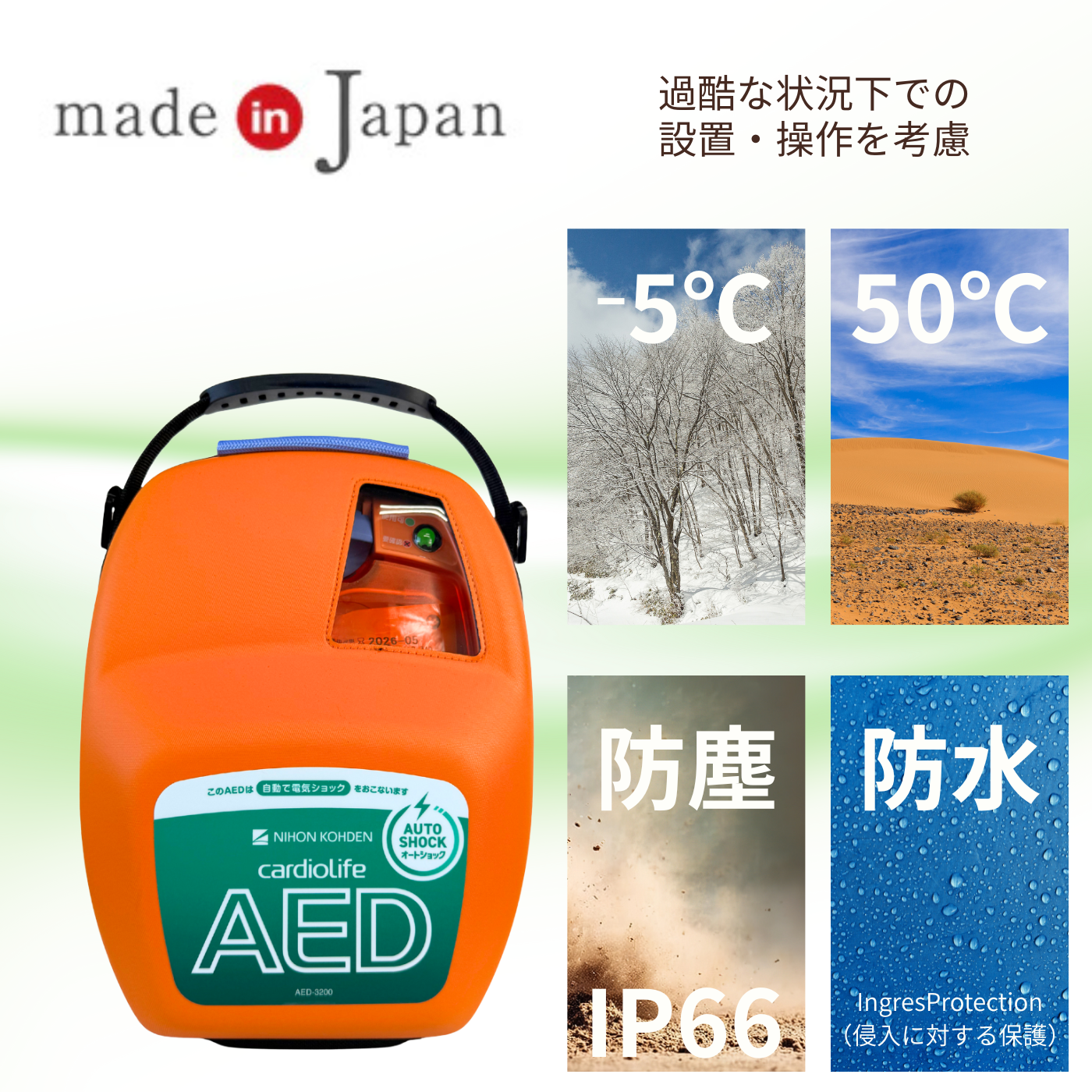 - -5~50℃の環境でも操作が可能。また、IP66に準拠した防塵性および防水性を備えており、過酷な状況でもの使用を考慮しました。