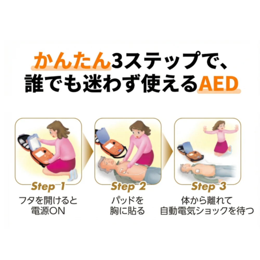 - 電気ショックが必要な場合、AEDが「離れてください。3、2、1」とカウントダウンを行い、自動で電気ショックを実施します 。