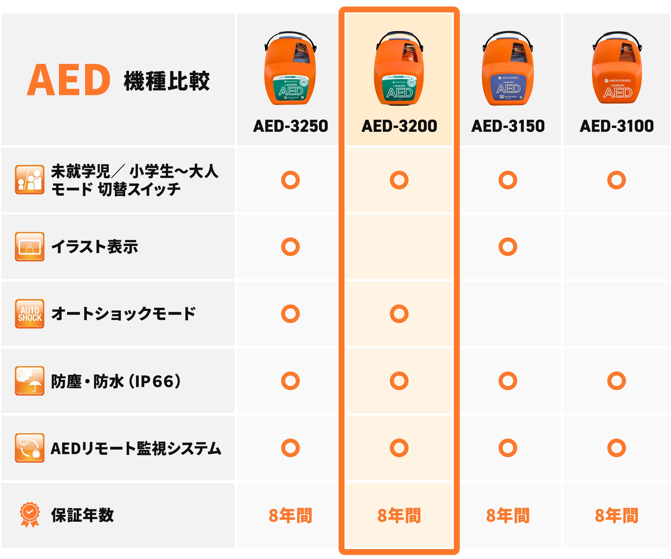 国内メーカー製のAEDのみを取り扱い、万が一の故障やトラブルにも安心していただける「本体8年保証」を標準でご提供しています。