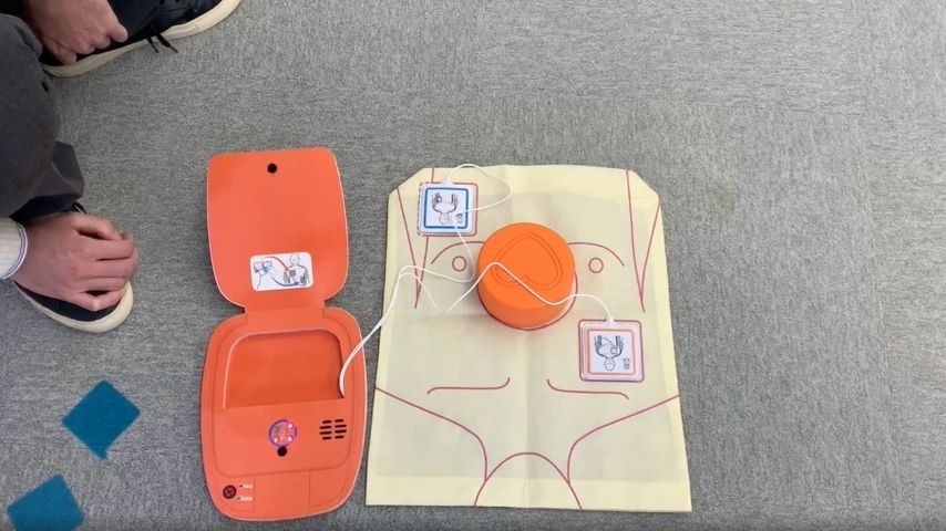 《疑似AED》フタを開くと電源ON→パッド貼り付け→電気ショック→胸骨圧迫